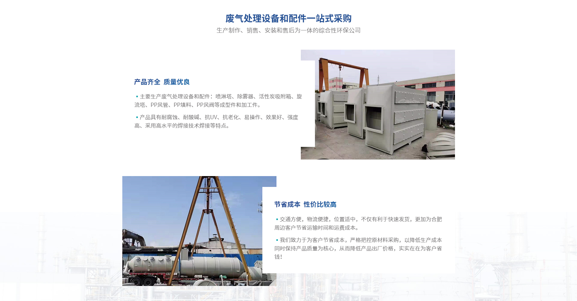 合肥熙誠環(huán)保科技有限公司是熙誠環(huán)保合肥分公司,是一家集產品生產制作、銷售、安裝和售后為一體的綜合性環(huán)保公司。主要生產廢氣處理設備和配件:噴淋塔、除霧器、活性炭吸附箱、旋流塔、PP風管、PP填料、PP風閥等成型件和加工件,產品具有耐腐蝕、耐酸堿、抗UV、抗老化、易操作、效果好、強度高、采用高水平的焊接技術焊接等特點;滿足客戶一站式采購的要求。廣泛應用于電子業、化工業、醫藥業、紡織業、橡塑業、汽車業、...